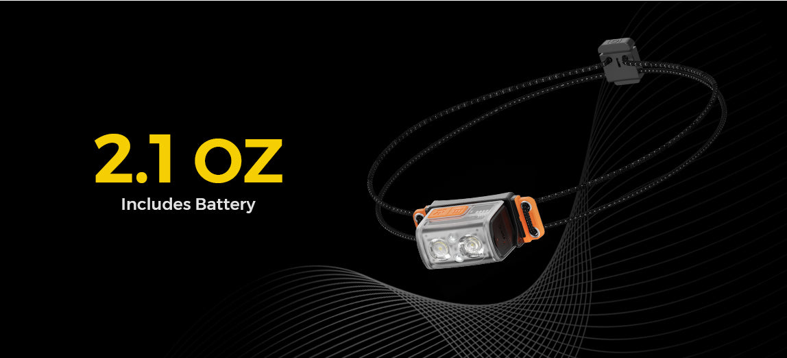 Headlamp weighs only 2.1 OZ (59.5g) including battery