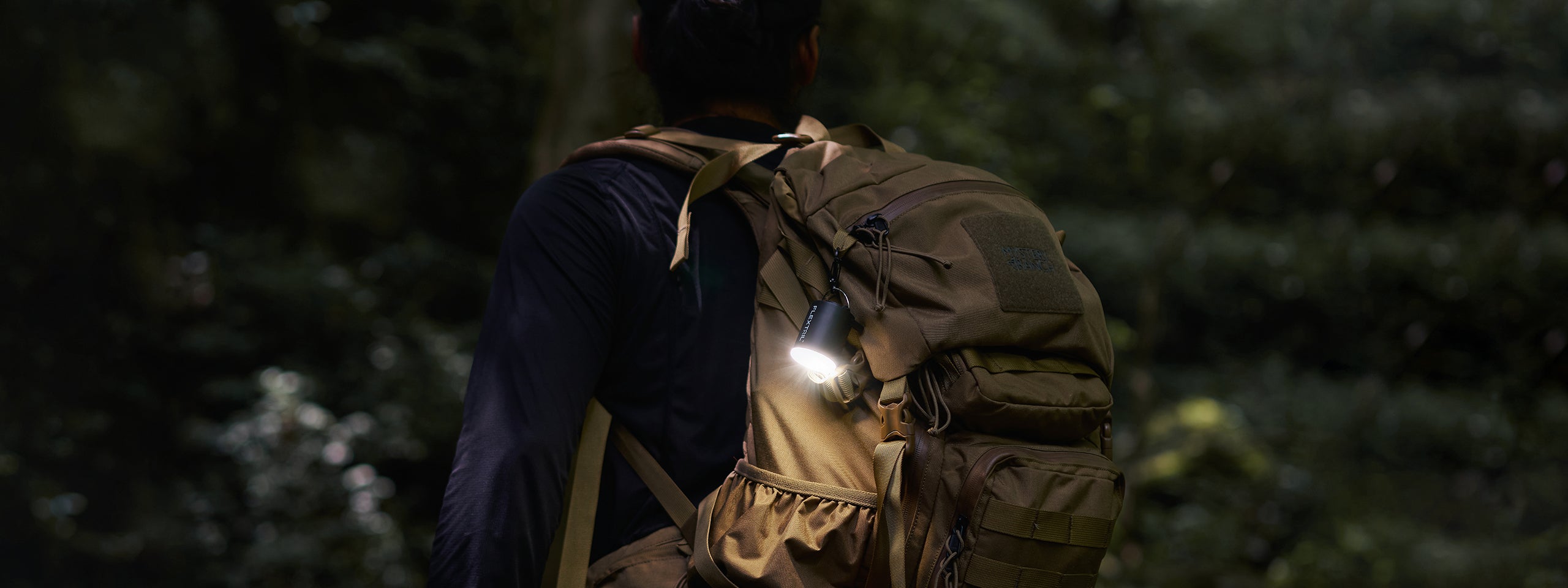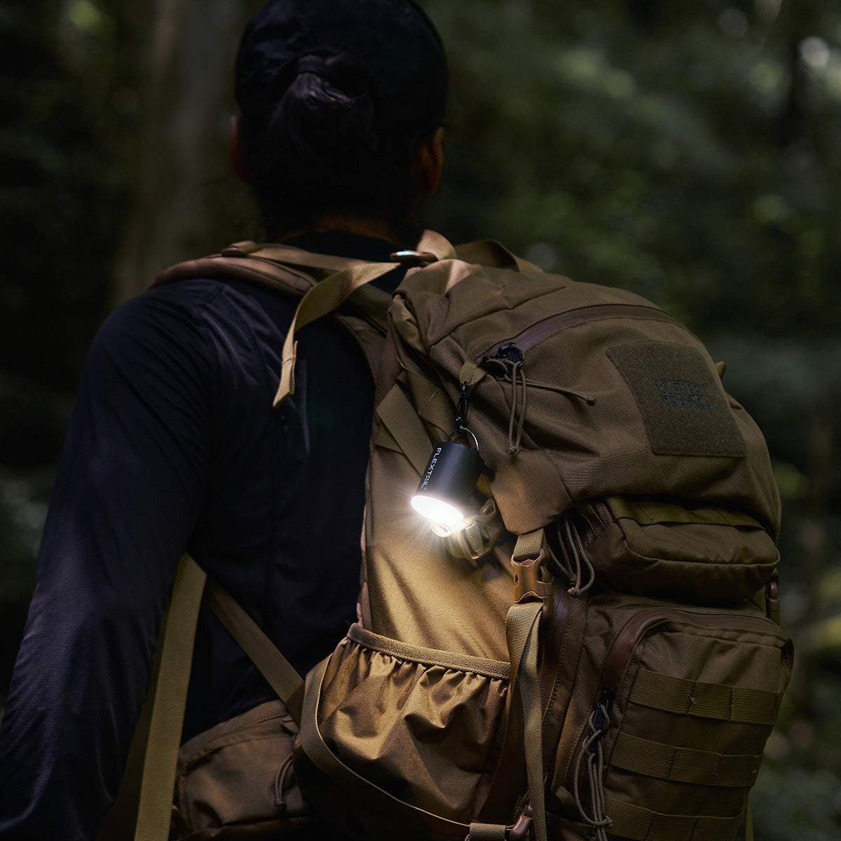 Hold on for three seconds to turn on. The three brightness (200 lumens / 100 lumens / 20 lumens) settings offer the desired light wherever you go, and the illumination can last up to 22 hours.