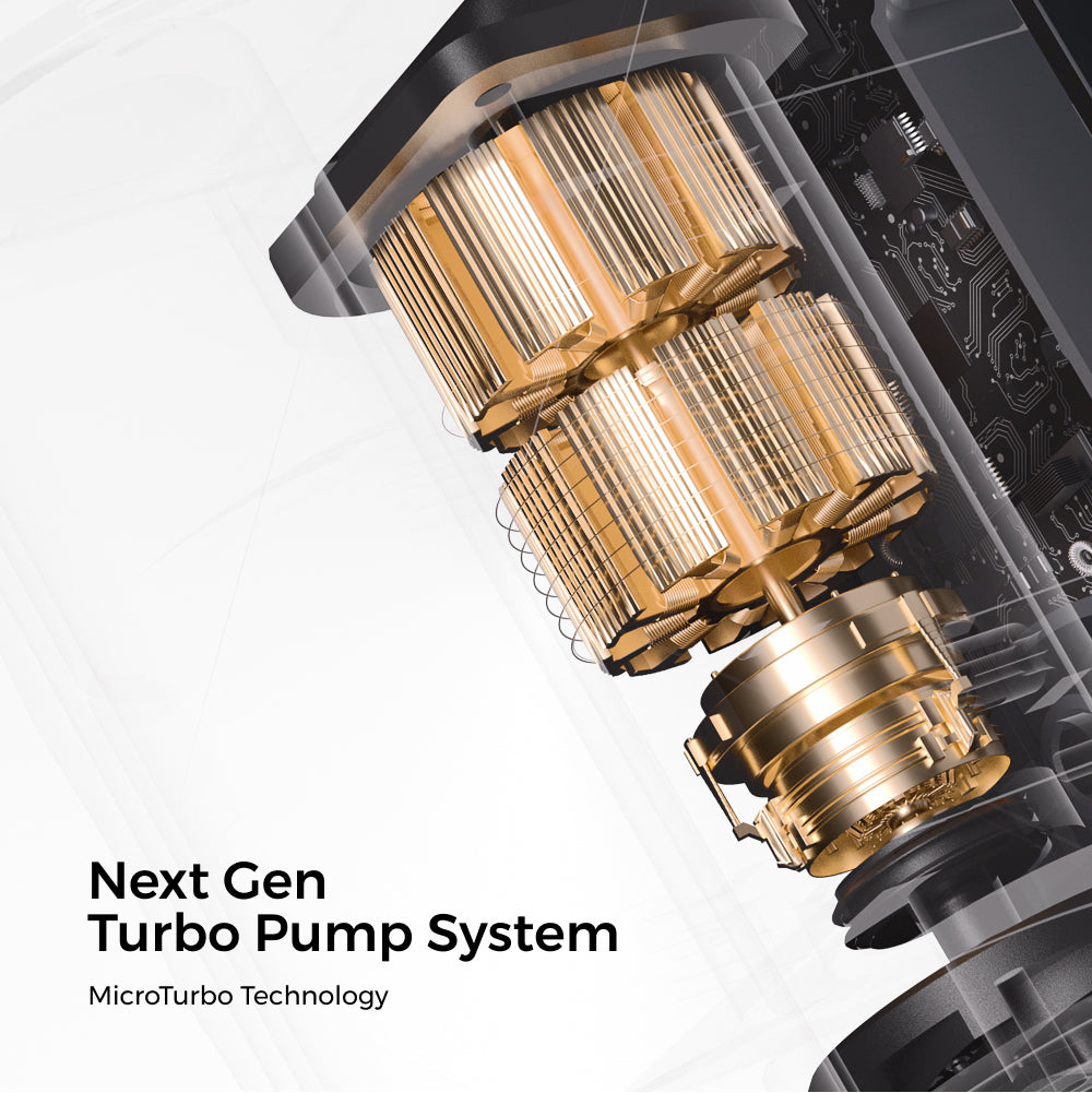 Forget wrestling with clunky setups and dribbling flows. Our palm-sizedpowerhouse packs patented MicroTurbo" tech into an integrated air pumpdelivering a consistent, high-pressure stream at the push of a button-noplumbing, pedals, or fuss required.