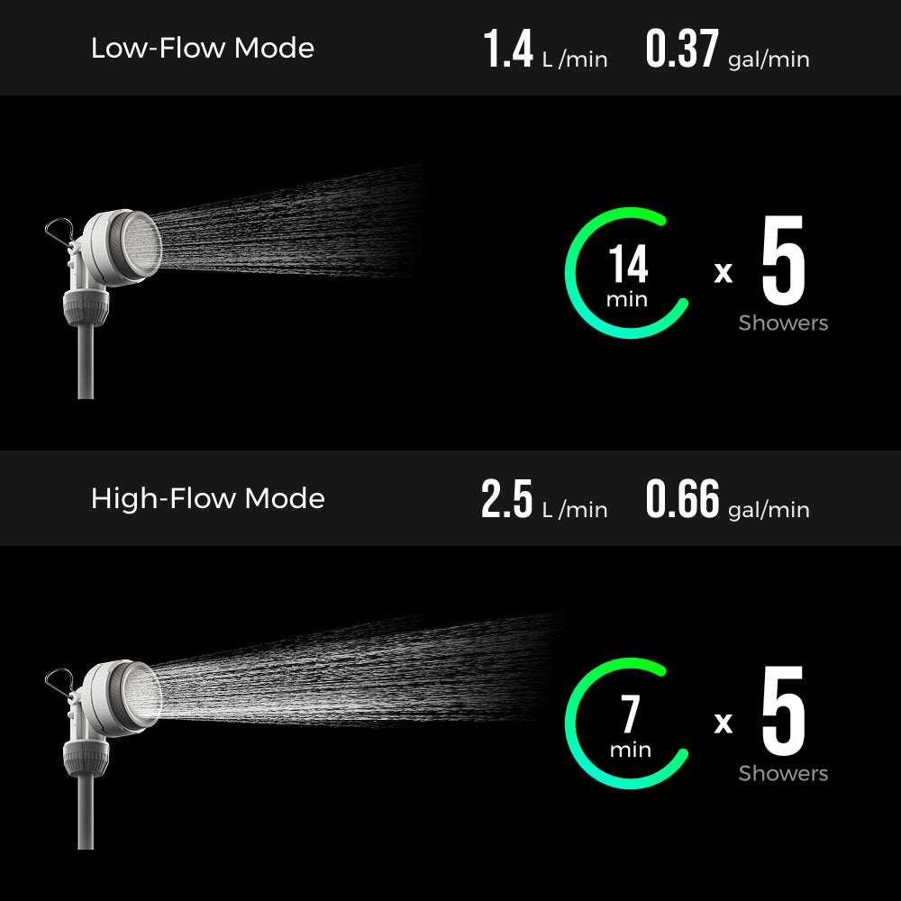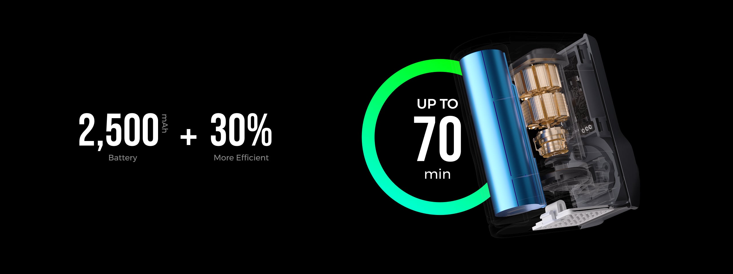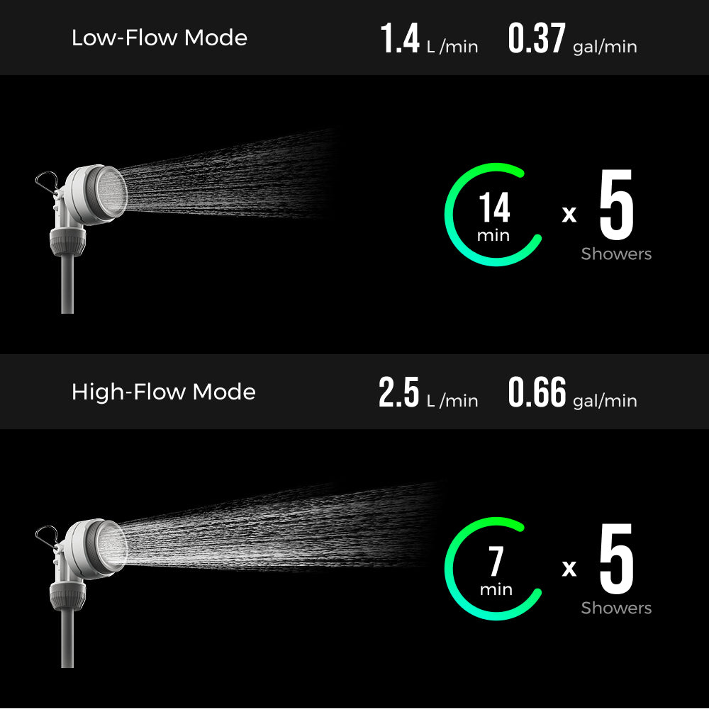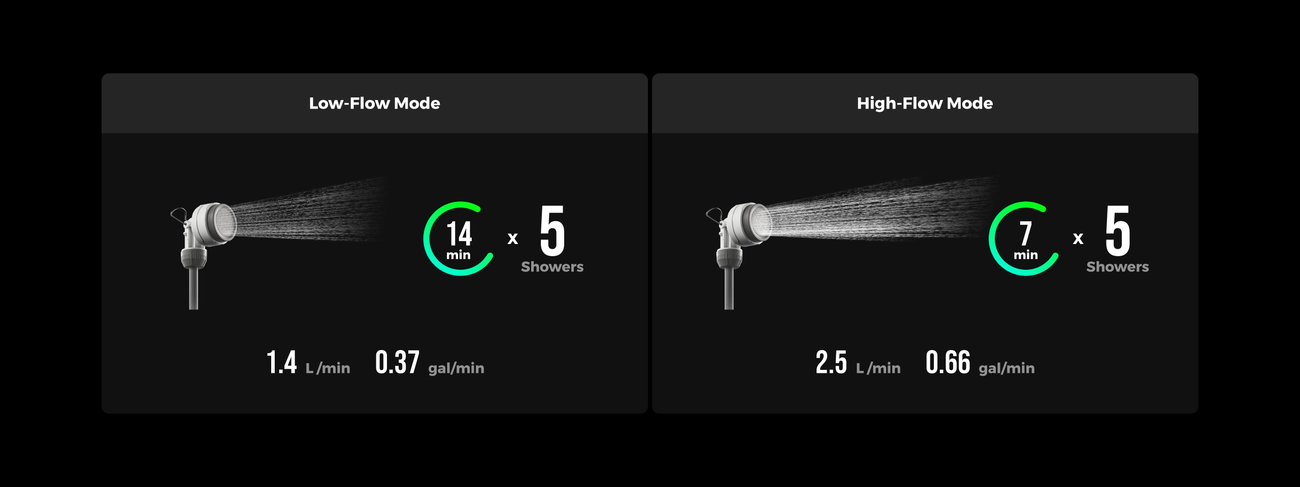 Our 2,500 mAh battery, paired with a 30% more efficient pump, delivers up to70 minutes of continuous runtime-enough for five 14-minute showers on asingle USB-C fast charge. Intelligent battery management ensures hundreds ofhealthy cycles.
