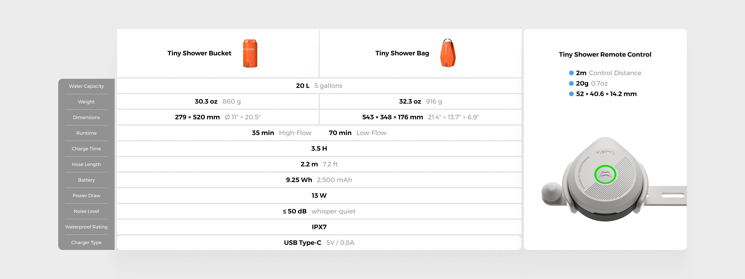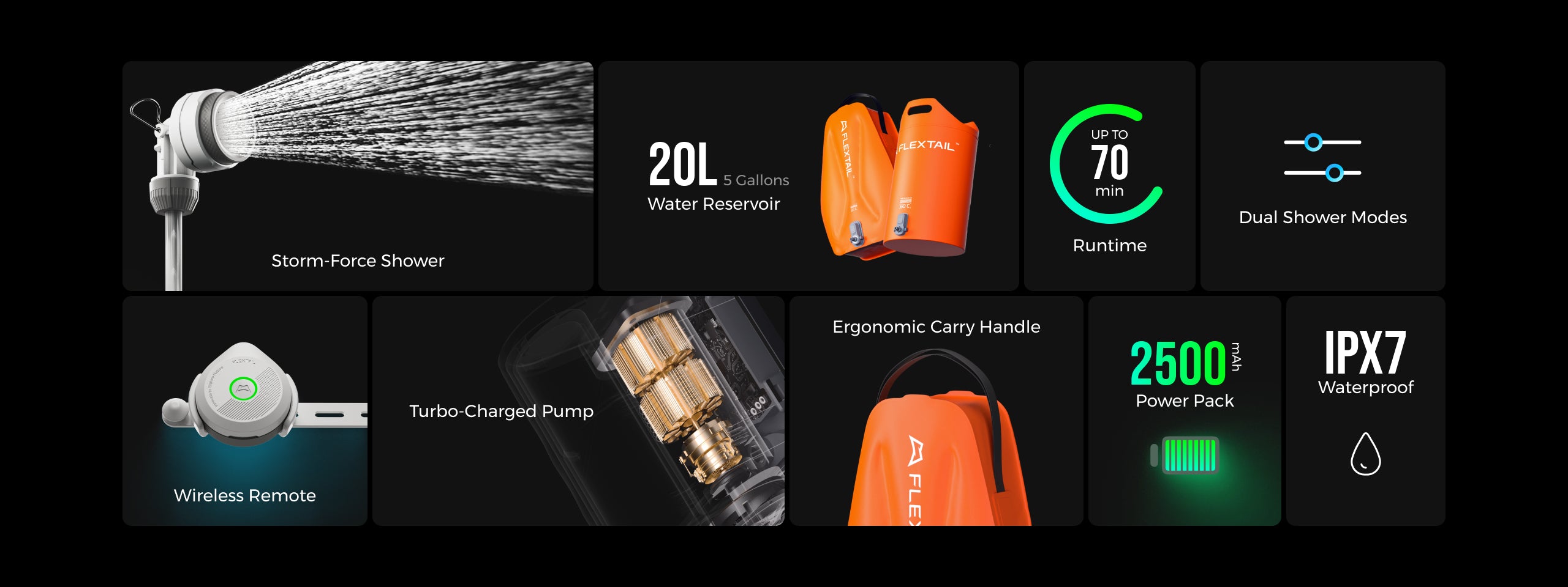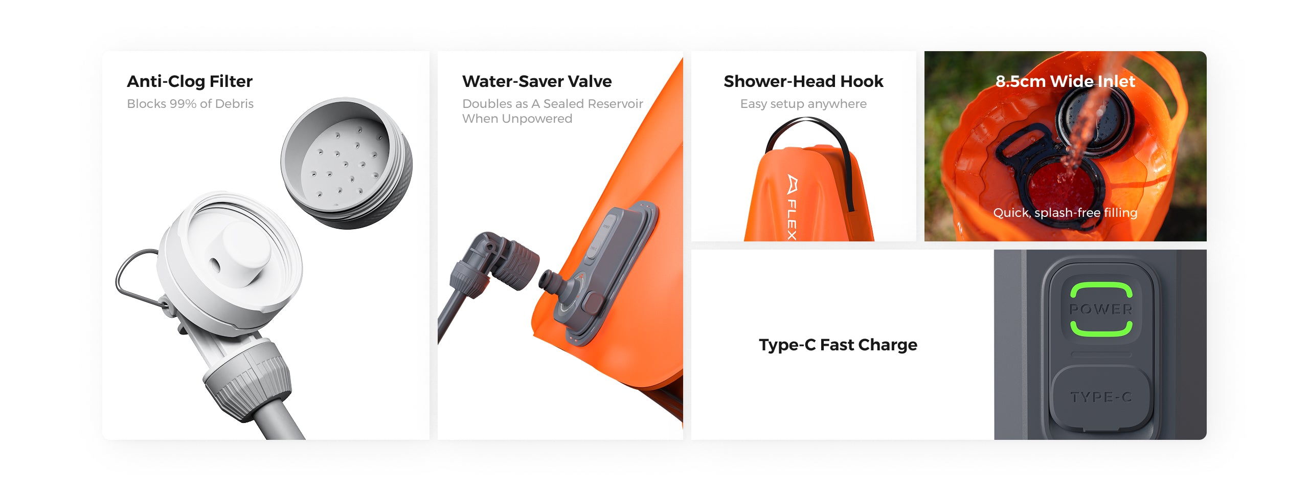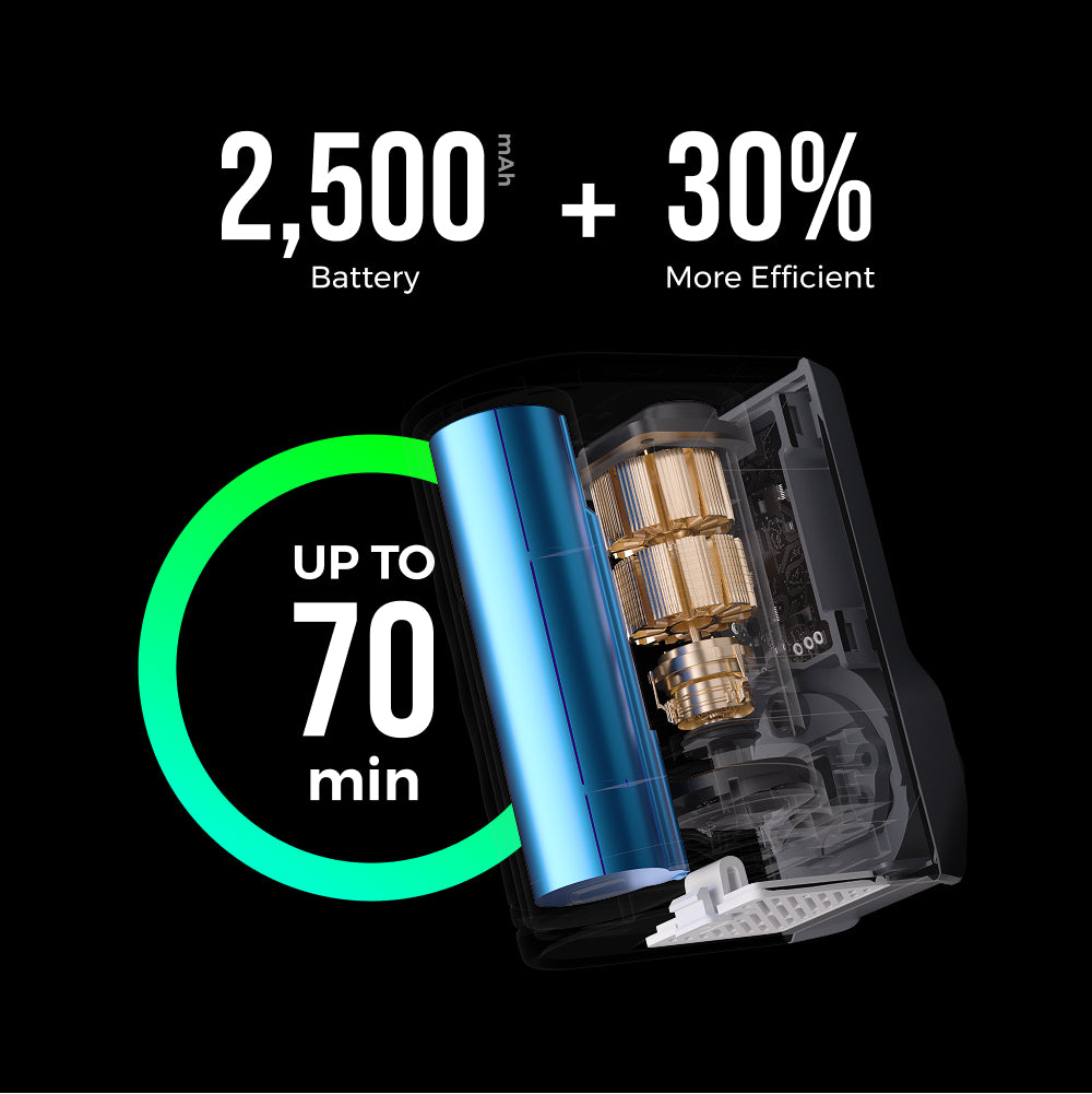 Our 2,500 mAh battery, paired with a 30% more efficient pump, delivers up to70 minutes of continuous runtime-enough for five 14-minute showers on asingle USB-C fast charge. Intelligent battery management ensures hundreds ofhealthy cycles.