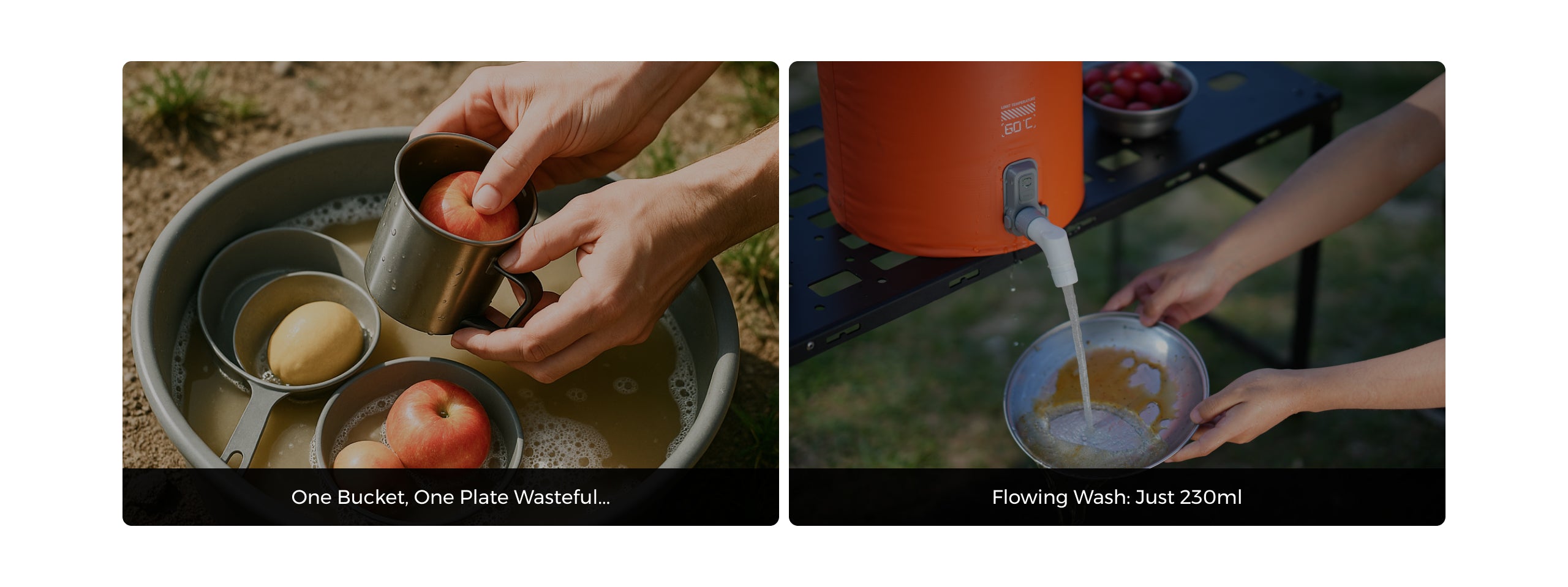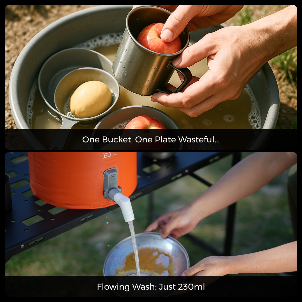 Dunking a dish in a whole bucket barely cleans, yet a 230 ml stream blastsaway grease in seconds-proving that moving water delivers a deeper cleanwith far less waste.