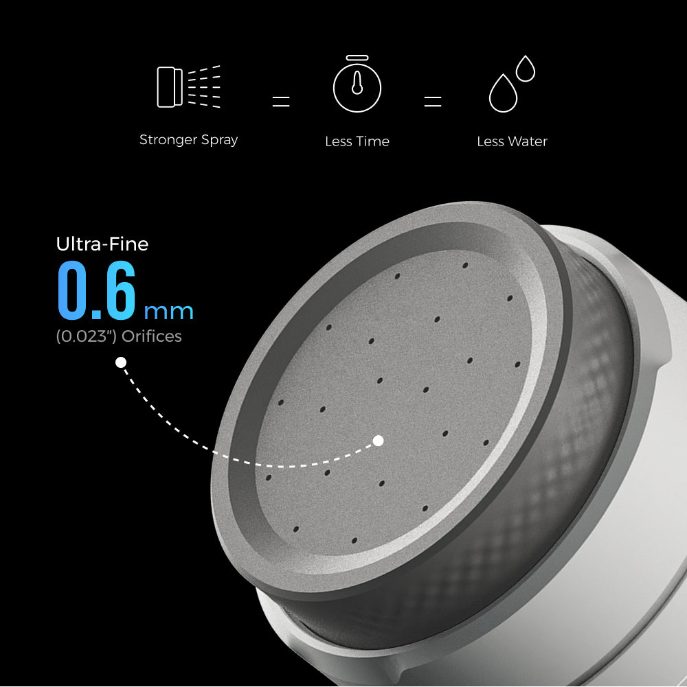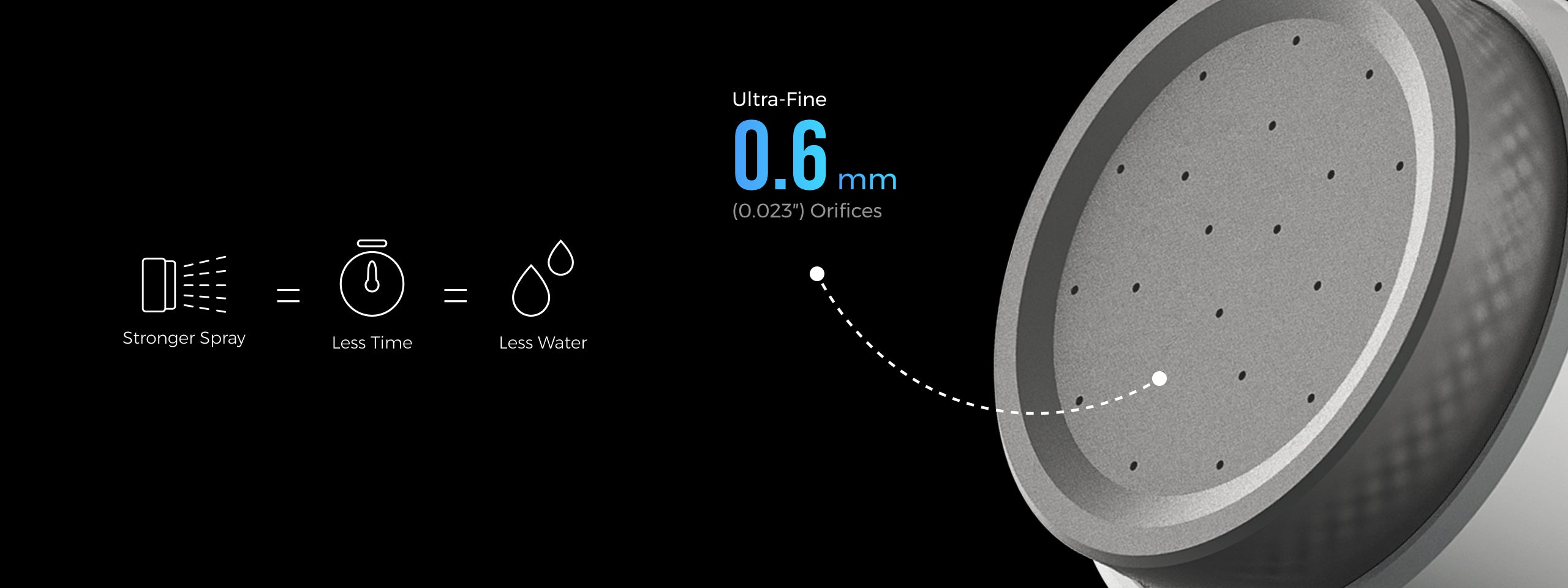 Engineered with ultra-fine 0.6mm( 0.023") orifices, our shower head boostspressure while using less water-delivering a powerful clean without waste.