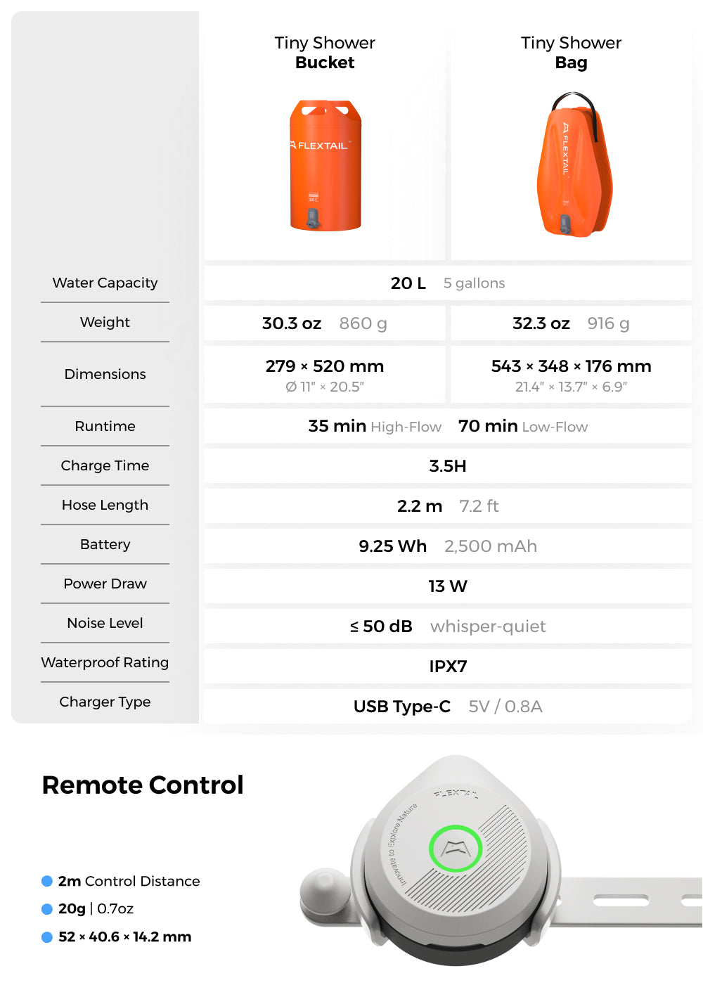 The Tiny Shower Bag is near to be perfect for my needs and even better with the remote control. I hope the battery and the pump will be OK for a while…
