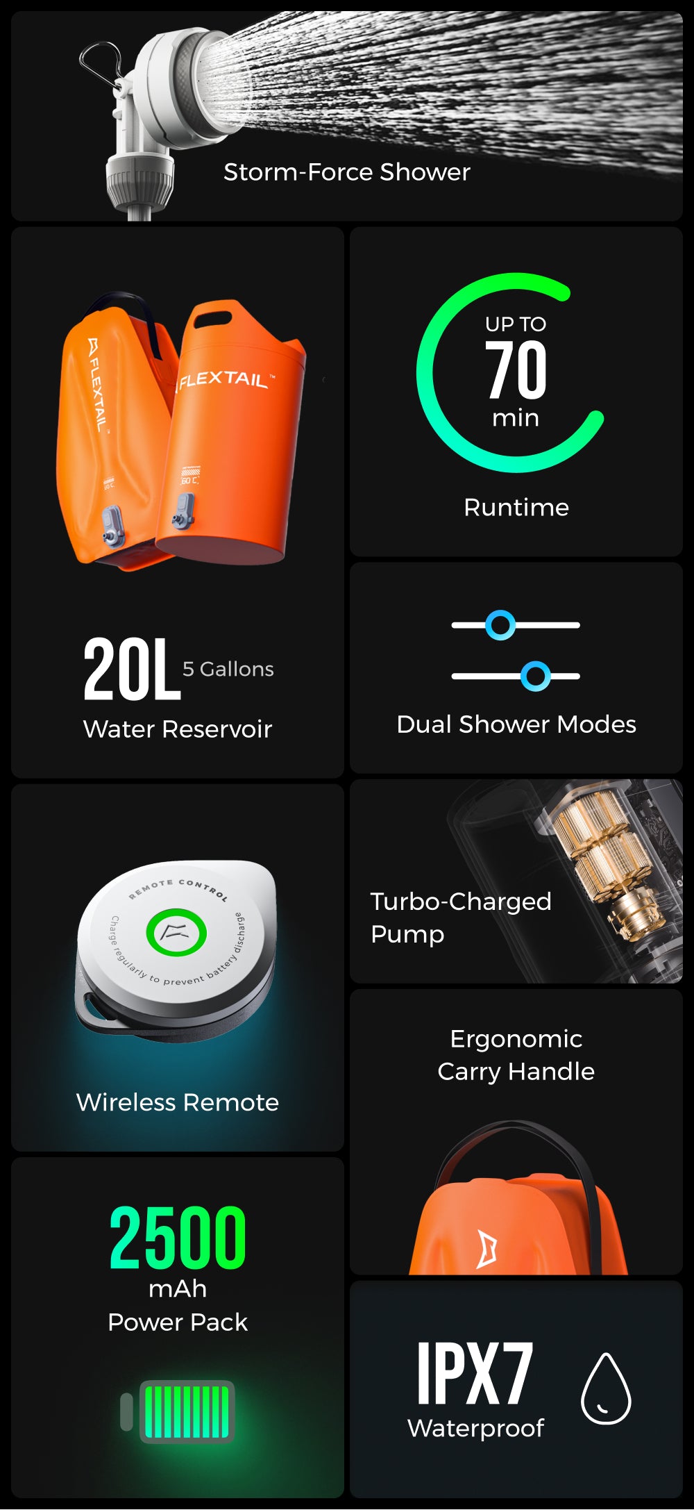 Our Sleek 20 L (5 Gallons) pack hides a built-in electric pump and shower head—no extra parts, no awkward hoses. Just fill it, press one button, and unleash a steady, high-pressure stream that replaces manual or foot-powered setups. Road trips, back-country camps, or beach days—get a quick, powerful rinse anywhere.