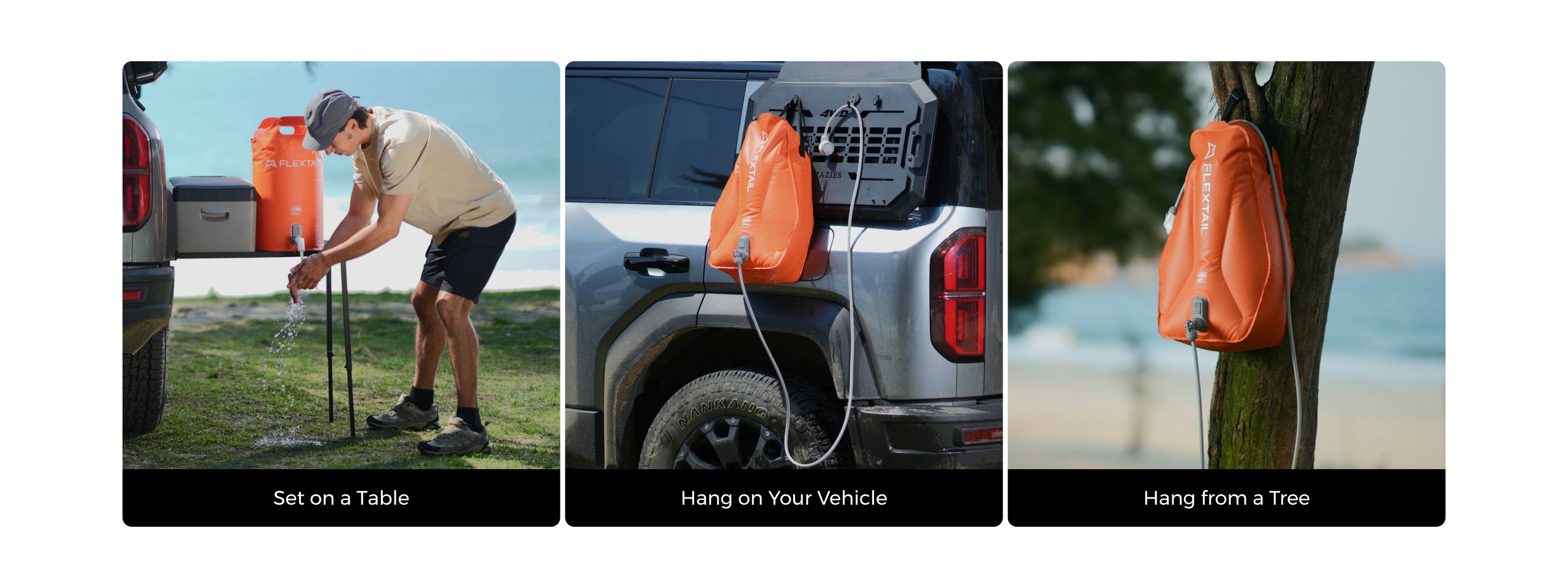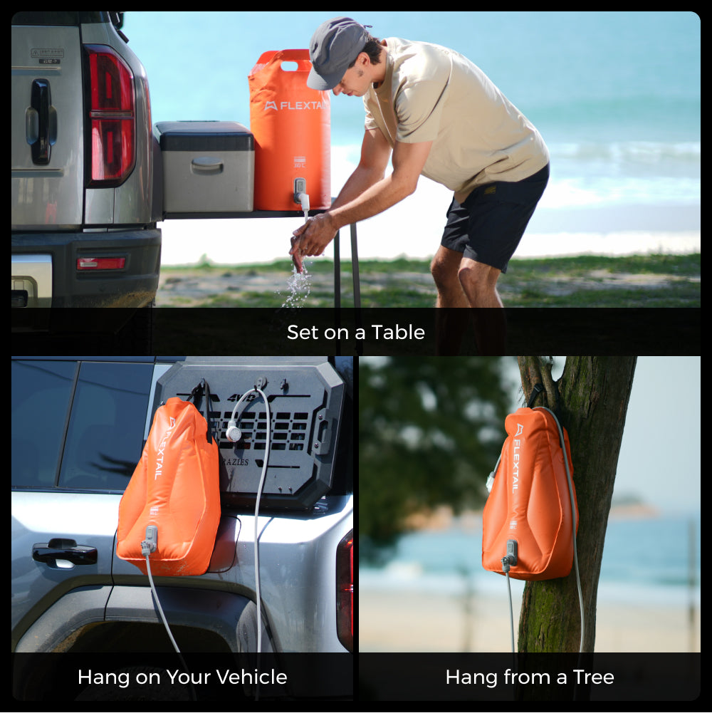 Built with a heavy-duty handle and a flat-bottom bucket base, this 20 L(5Gallons) pouch suspends from trees, vehicles, or rocks-or sits stable on anysurface. Lock in the pump for an instant shower, faucet, or cleanup stationwherever adventure leads.